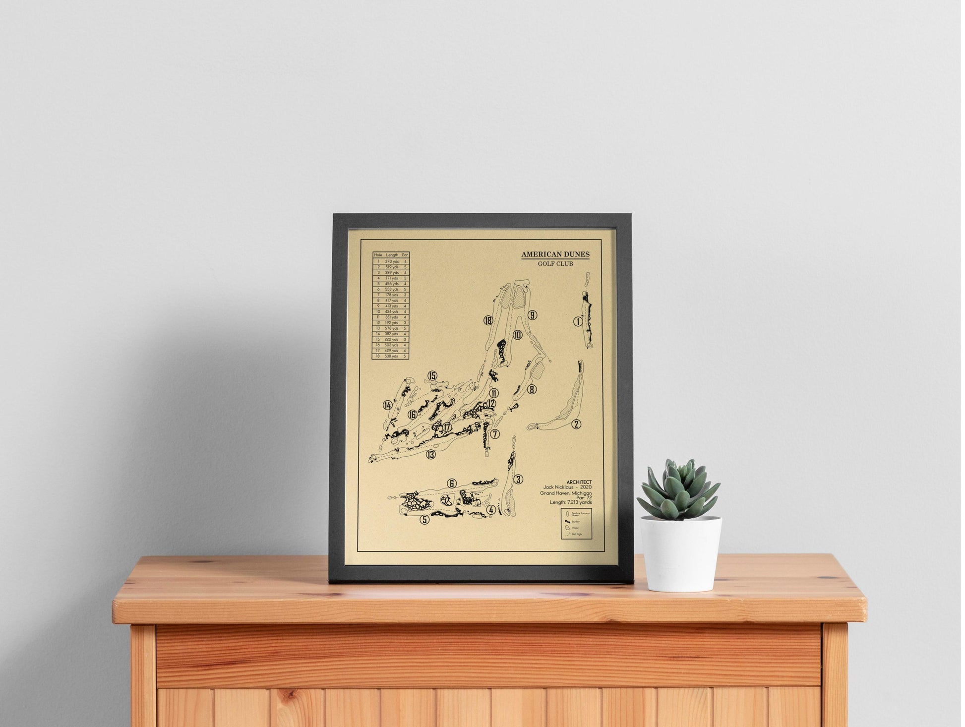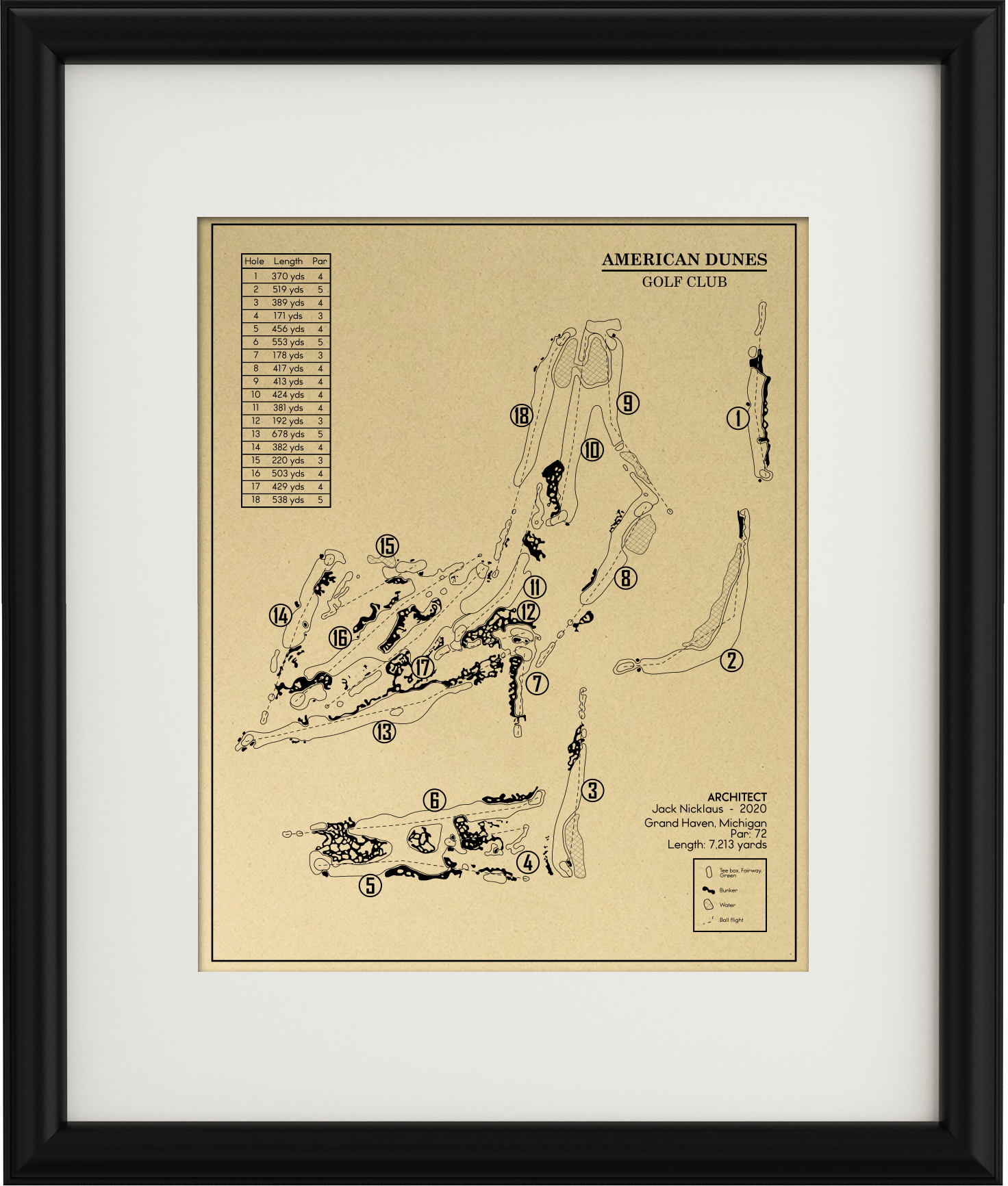 This Golf Course Outline is of American Dunes Golf Club in Grand Haven, Michigan. Included elements of the design are the water and bunker hazards, course length from the tips, and architects.