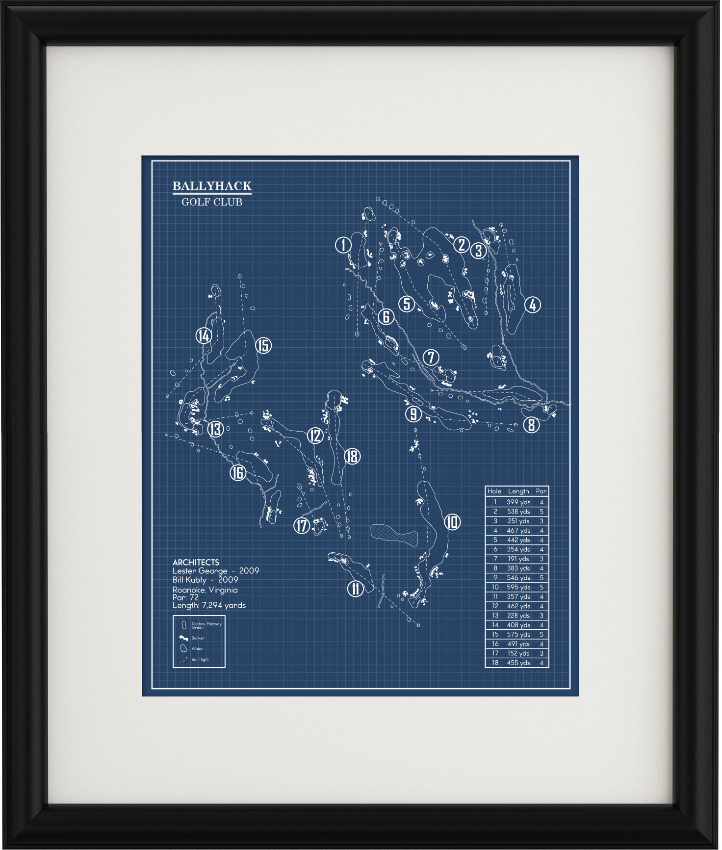 This Golf Course Blueprint is of Ballyhack Golf Club in Roanoke, Virginia. Included elements of the design are the water and bunker hazards, course length from the tips, and architects.