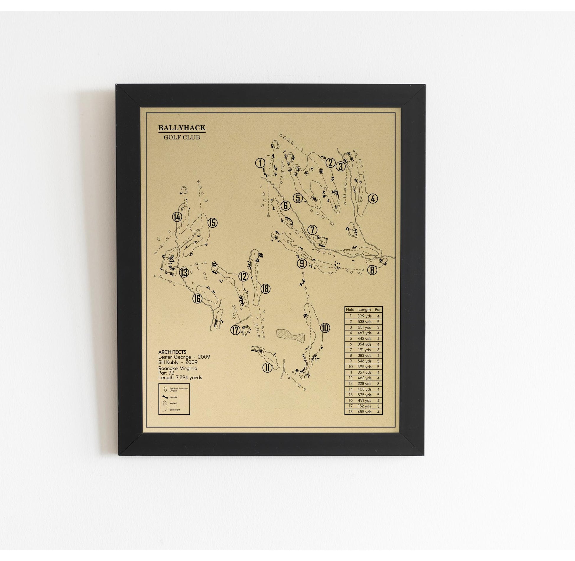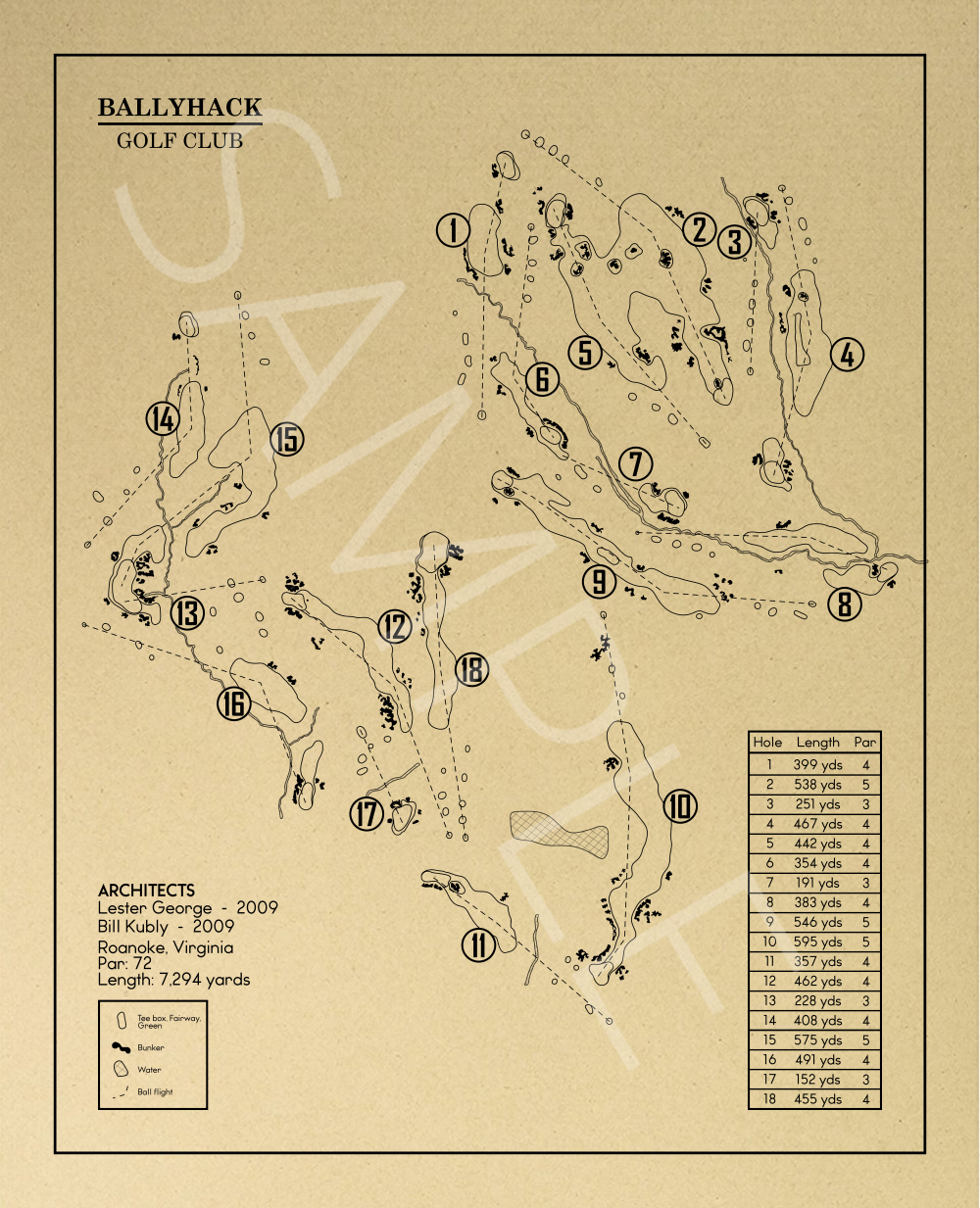 This Golf Course Outline is of Ballyhack Golf Club in Roanoke, Virginia. Included elements of the design are the water and bunker hazards, course length from the tips, and architects.