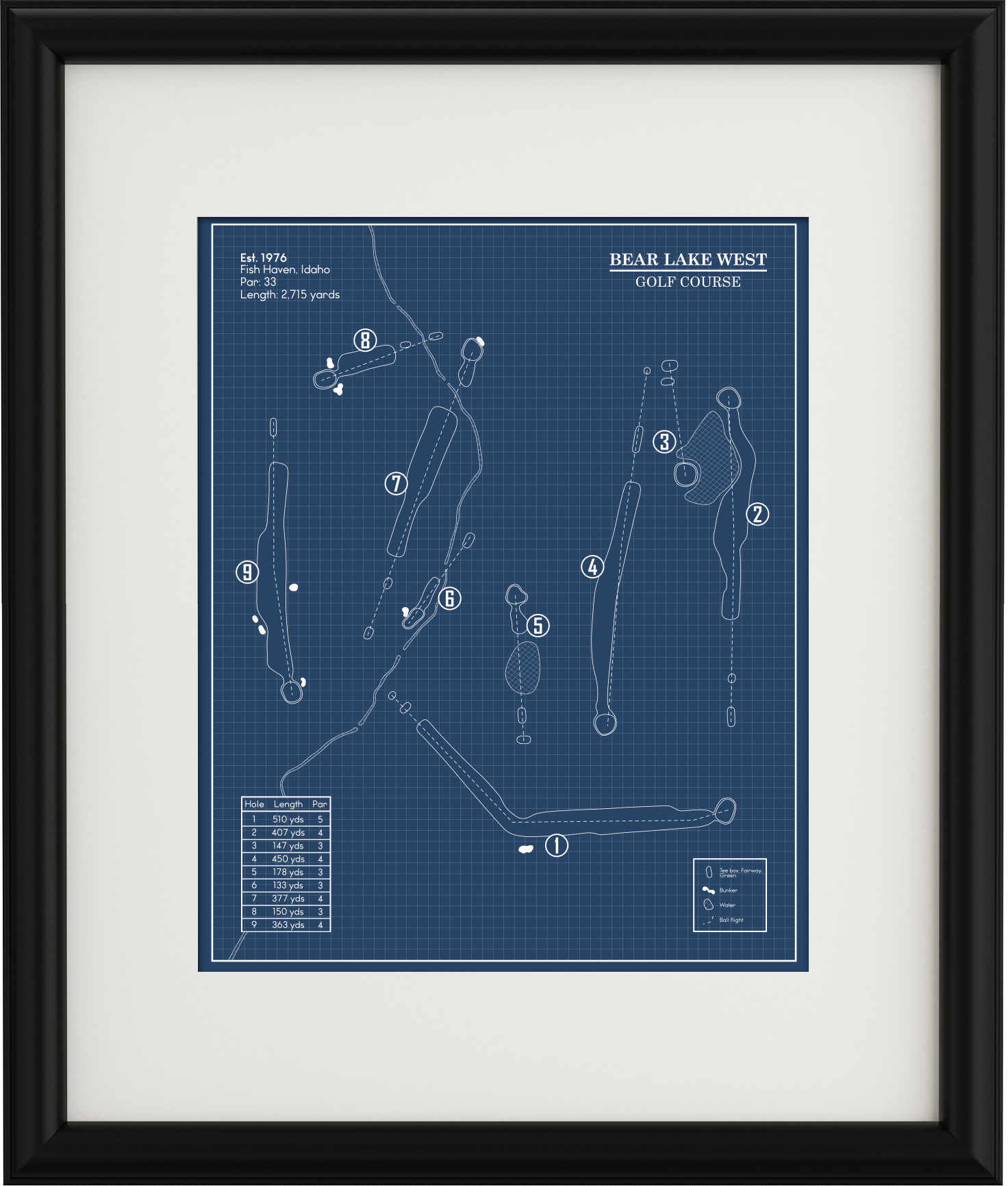 This Golf Course Blueprint is of Bear Lake West Golf Course in Fish Haven, Idaho. Included elements of the design are the water and bunker hazards, course length from the tips, and architects.