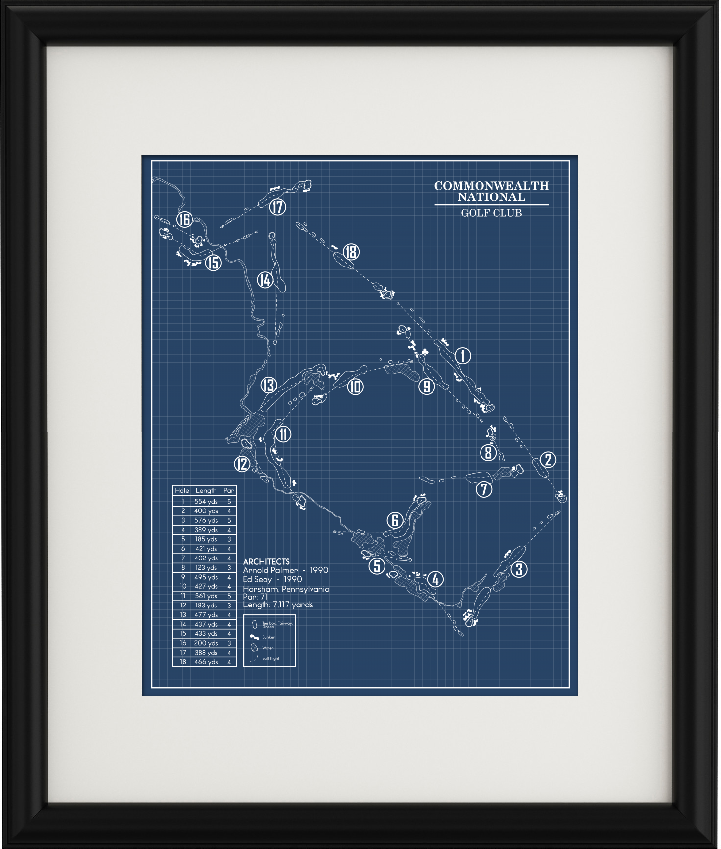 This Golf Course Blueprint is of Commonwealth National Golf Club in Horsham, Pennsylvania. Included elements of the design are the water and bunker hazards, course length from the tips, and architects.