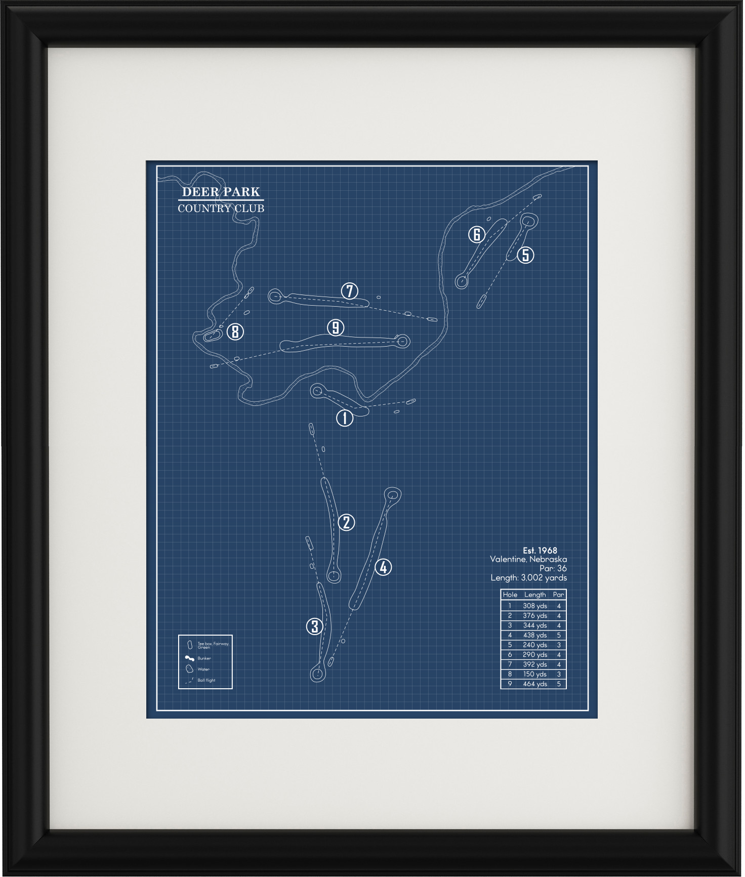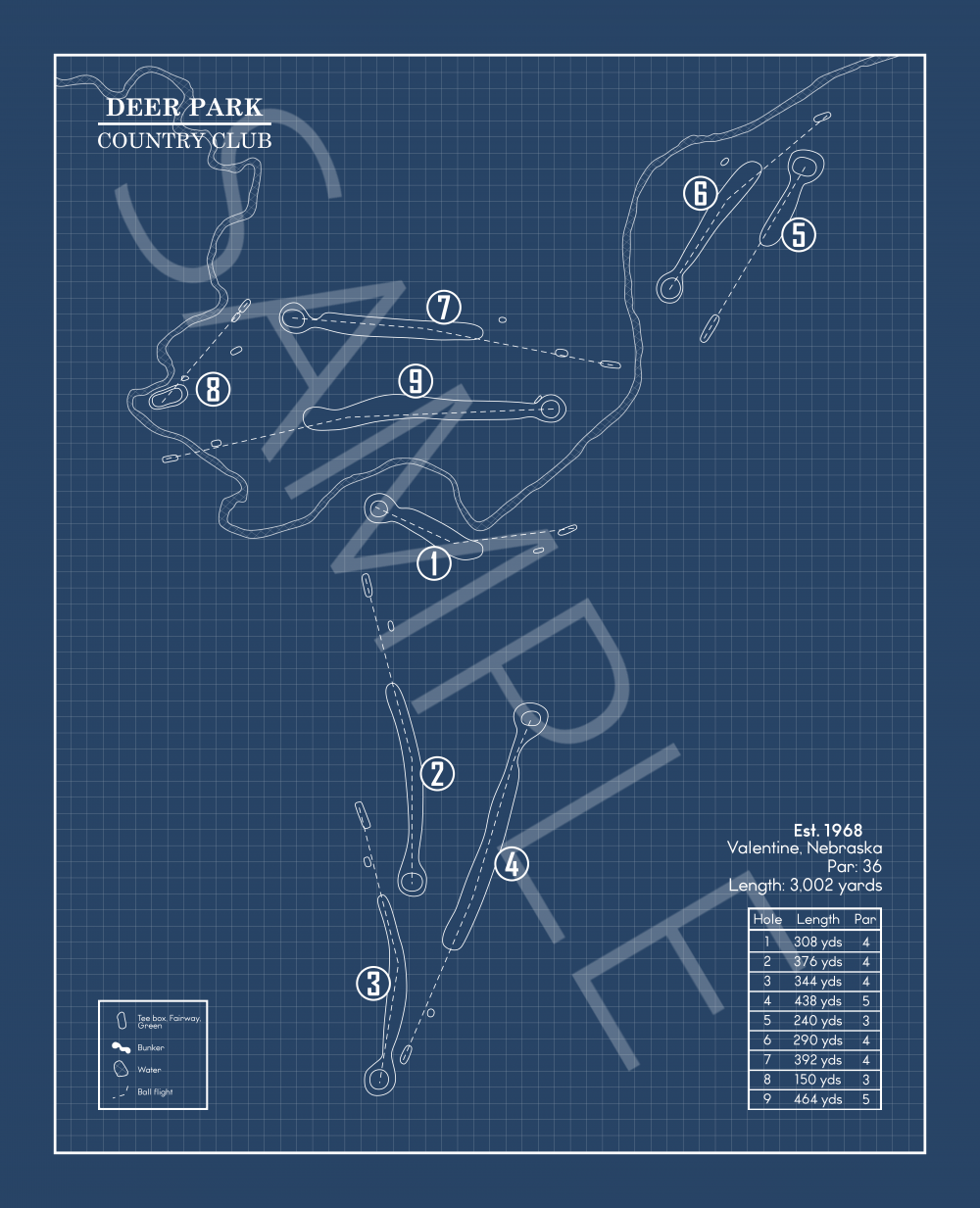 This Golf Course Blueprint is of Deer Park Country Club in Valentine, Nebraska. Included elements of the design are the water and bunker hazards, course length from the tips, and architects.