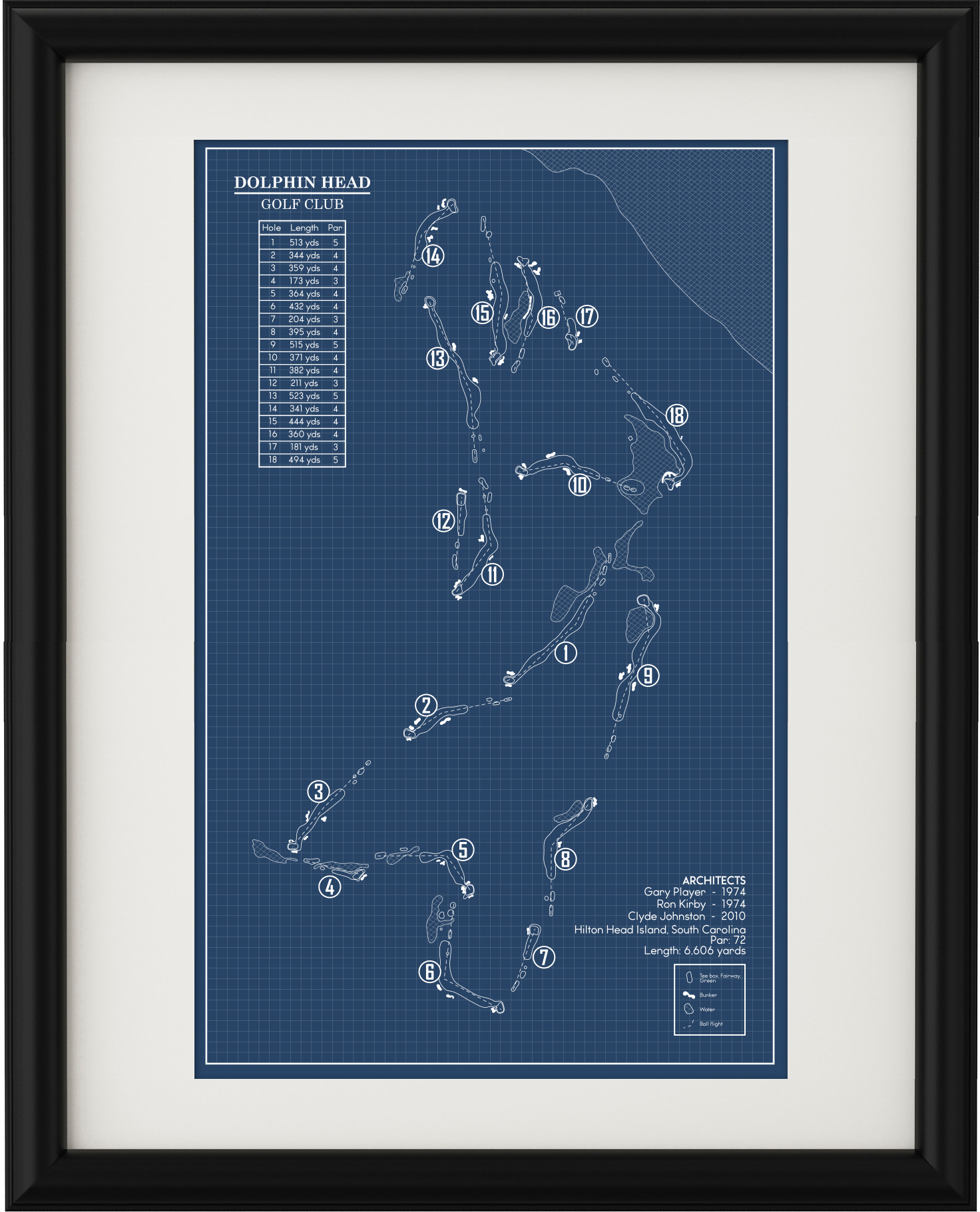This Golf Course Blueprint is of Dolphin Head Golf Club in Hilton Head Island, South Carolina. Included elements of the design are the water and bunker hazards, course length from the tips, and architects.