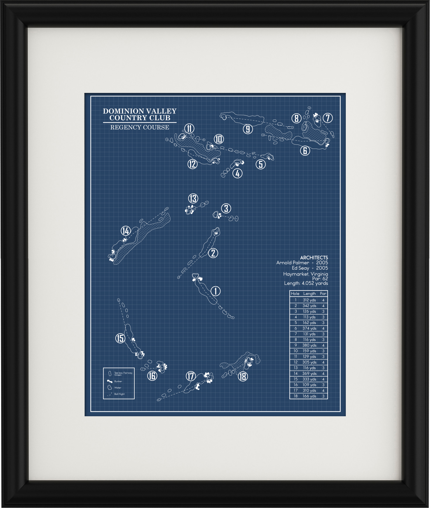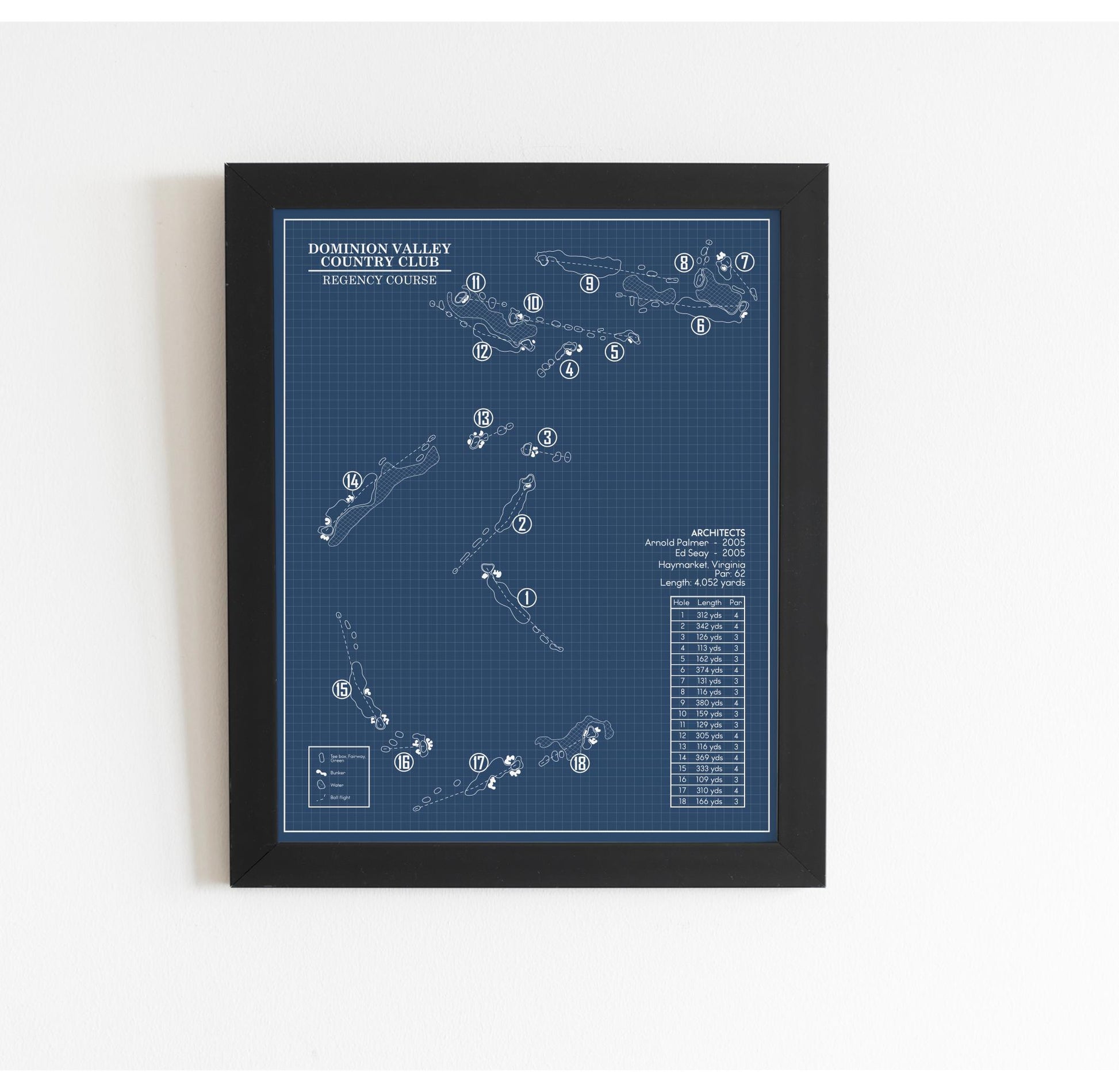 This Golf Course Blueprint is of Dominion Valley Country Club Regency Course in Haymarket, Virginia. Included elements of the design are the water and bunker hazards, course length from the tips, and architects.