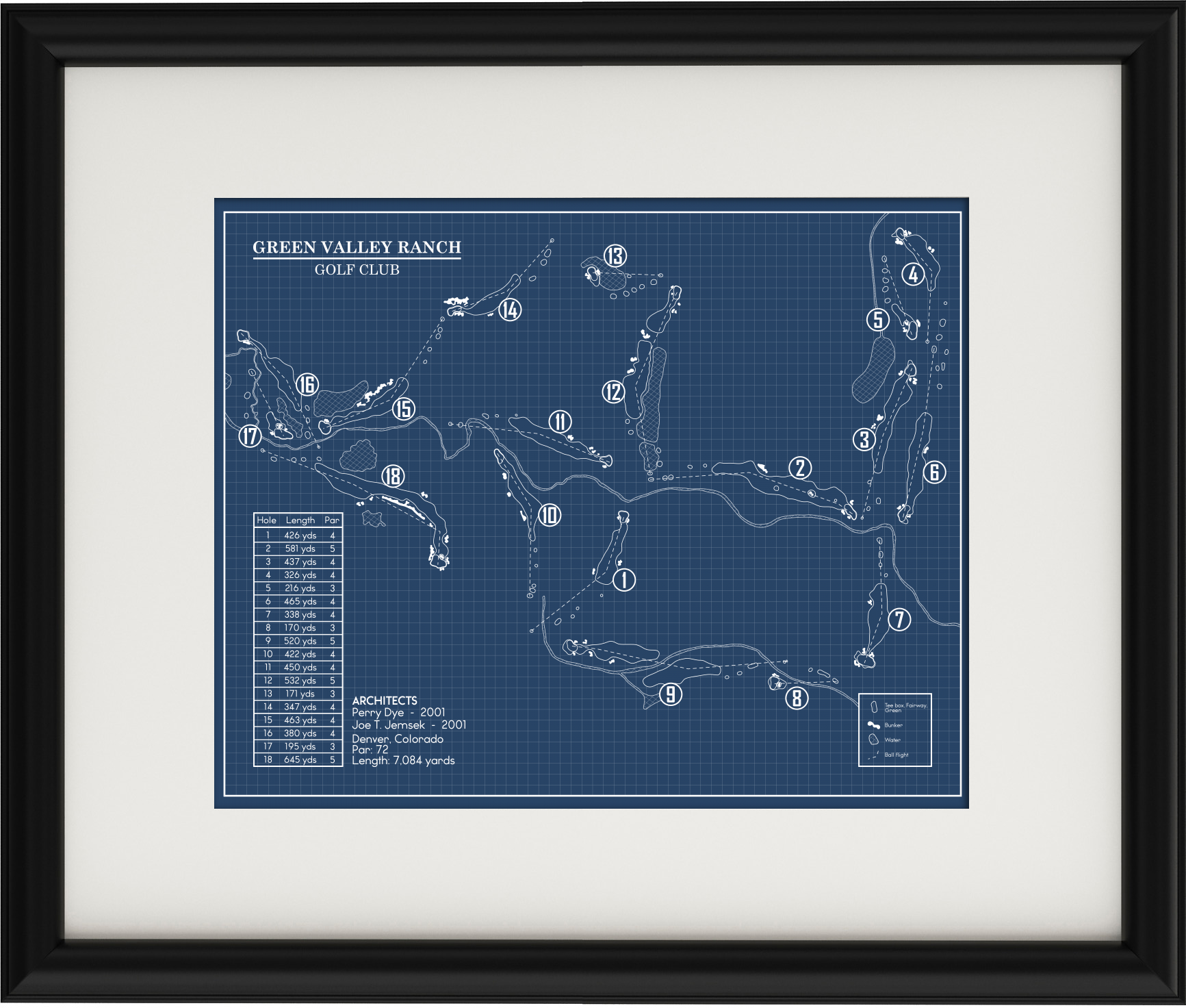 This Golf Course Blueprint is of Green Valley Ranch Golf Club in Denver, Colorado. Included elements of the design are the water and bunker hazards, course length from the tips, and architects.