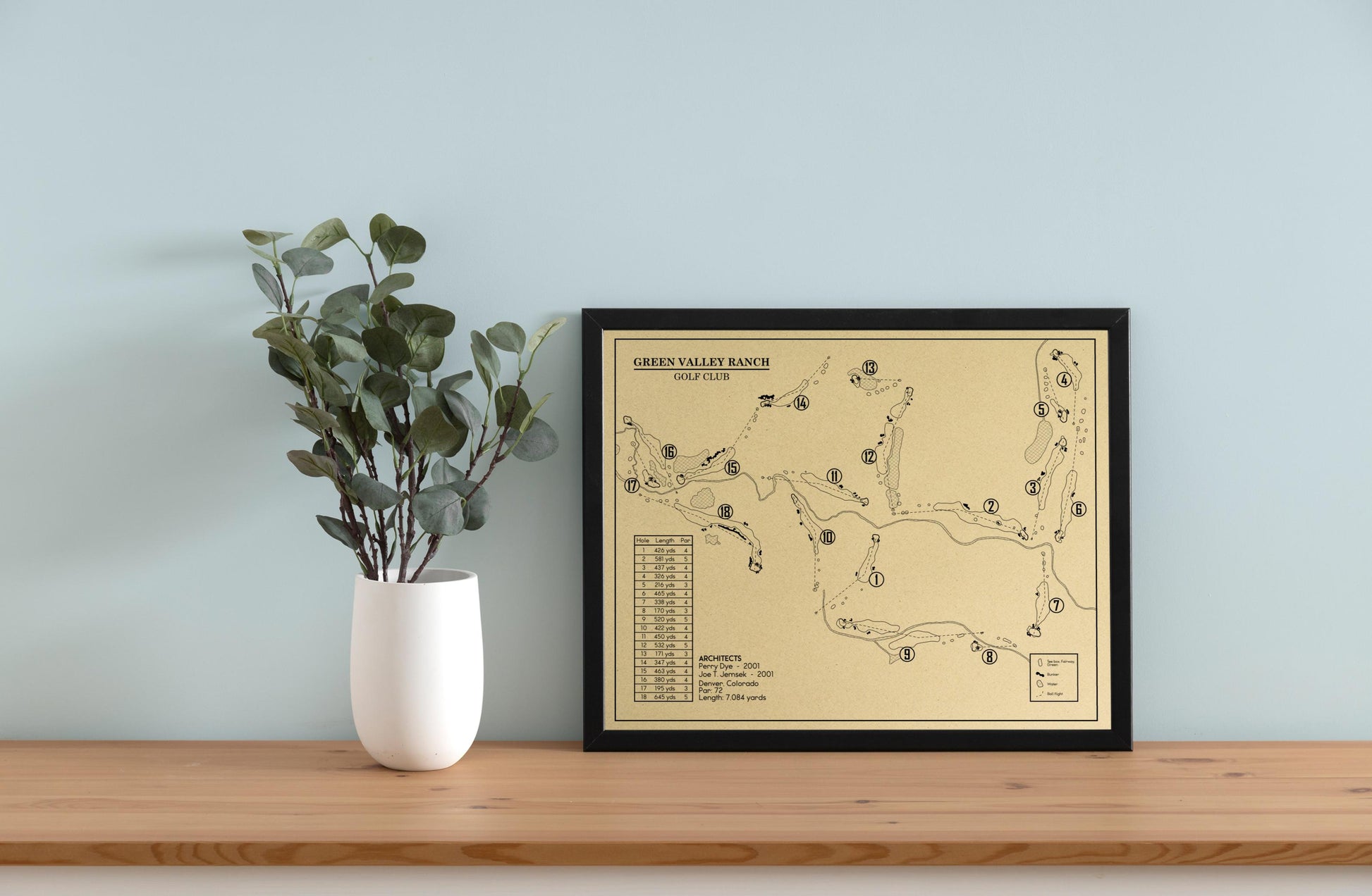 This Golf Course Outline is of Green Valley Ranch Golf Club in Denver, Colorado. Included elements of the design are the water and bunker hazards, course length from the tips, and architects.