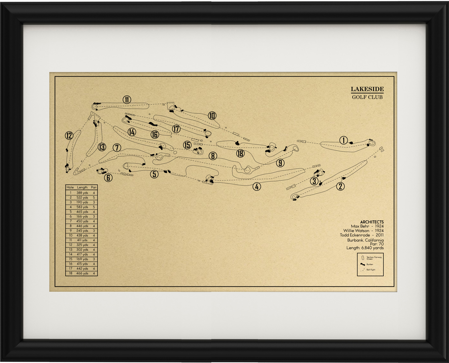 This Golf Course Outline is of Lakeside Golf Club in Burbank, California. Included elements of the design are the water and bunker hazards, course length from the tips, and architects.