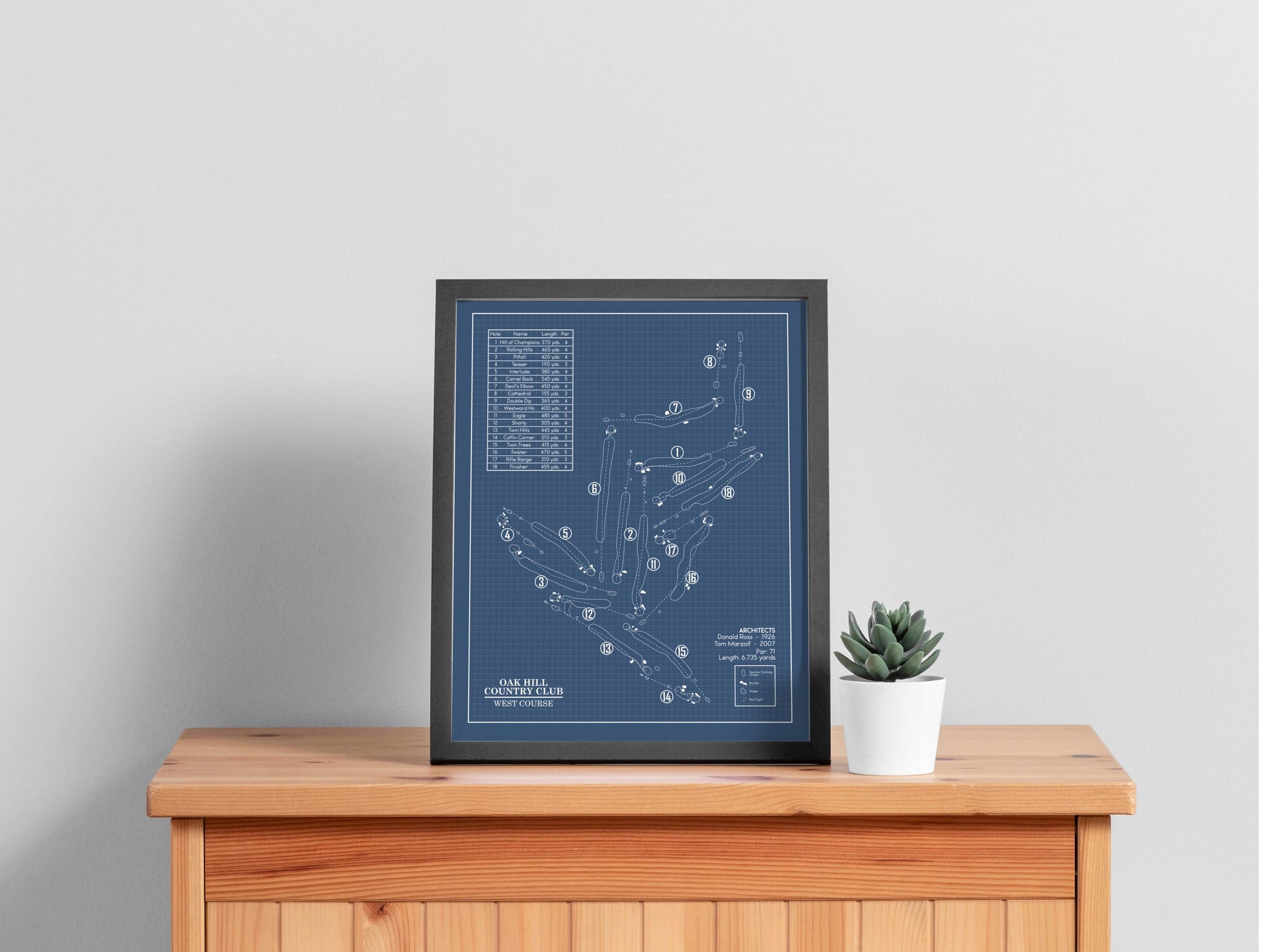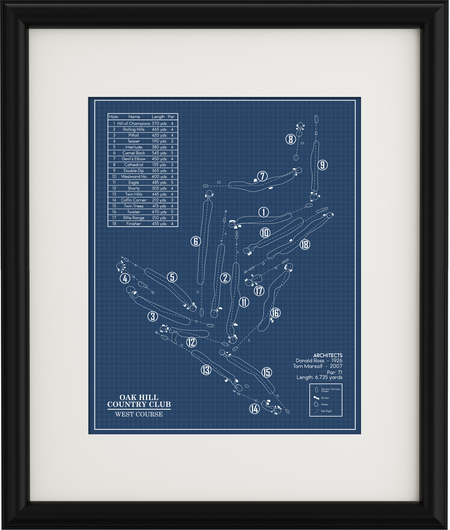 This Golf Course Blueprint is of Oak Hill Country Club West Course in Rochester, New York. Included elements of the design are the water and bunker hazards, course length from the tips, and architects.