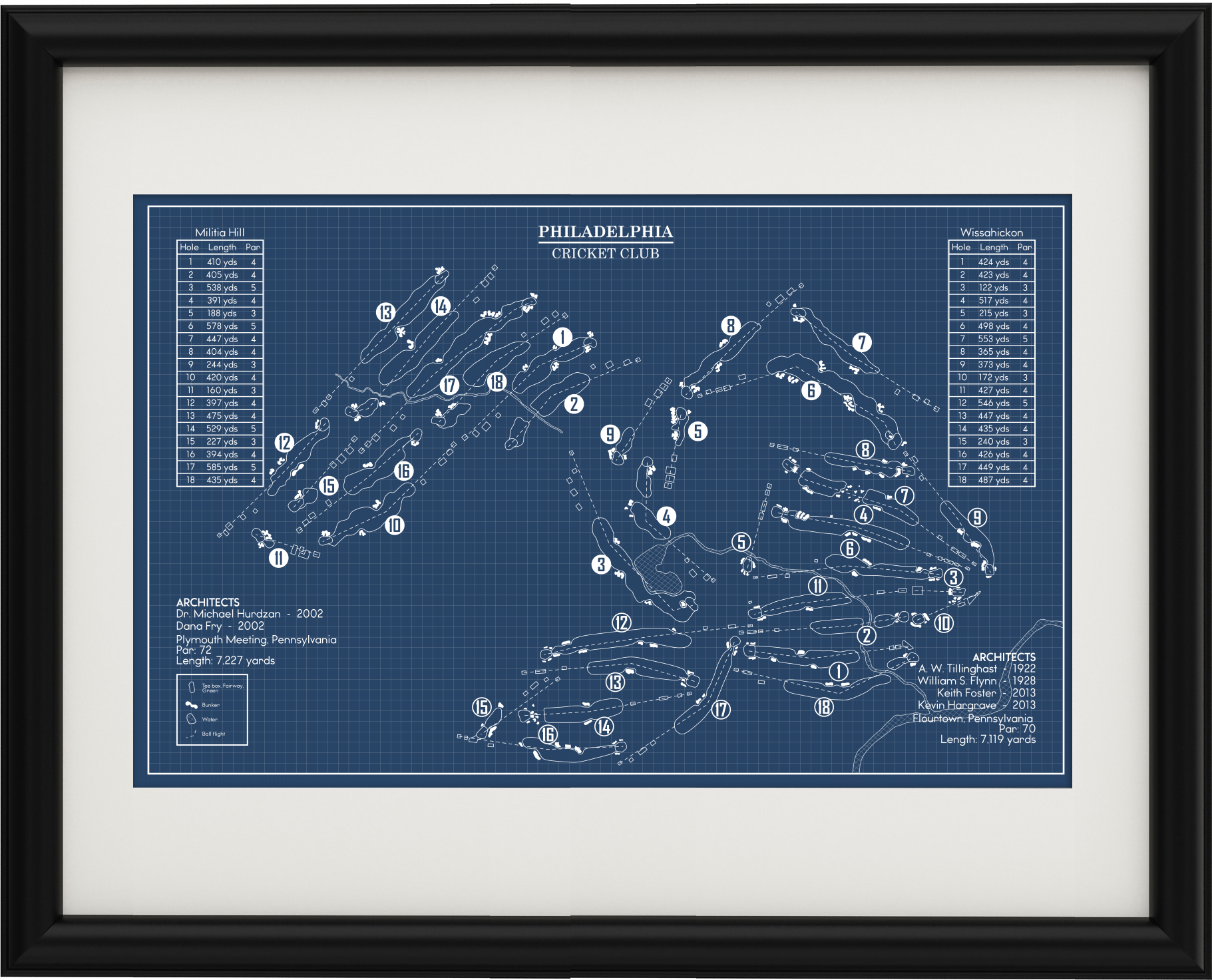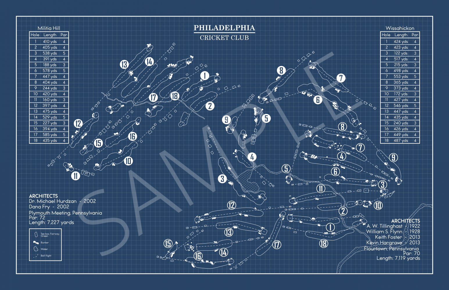 This Golf Course Blueprint is of Philadelphia Cricket Club in Flourtown, Pennsylvania. Included elements of the design are the water and bunker hazards, course length from the tips, and architects.