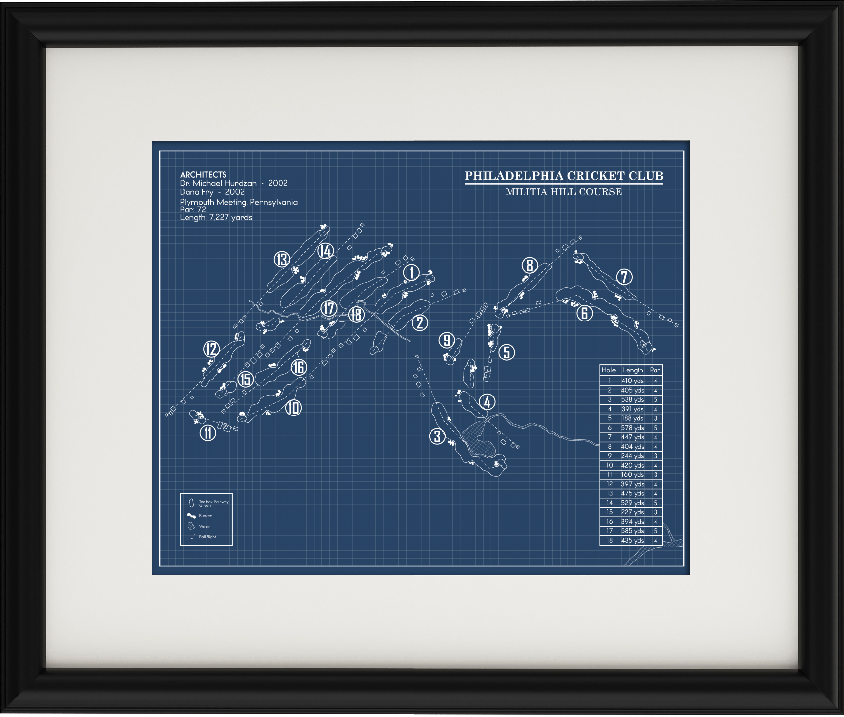 This Golf Course Blueprint is of Philadelphia Cricket Club Militia Hill Course in Plymouth Meeting, Pennsylvania. Included elements of the design are the water and bunker hazards, course length from the tips, and architects.