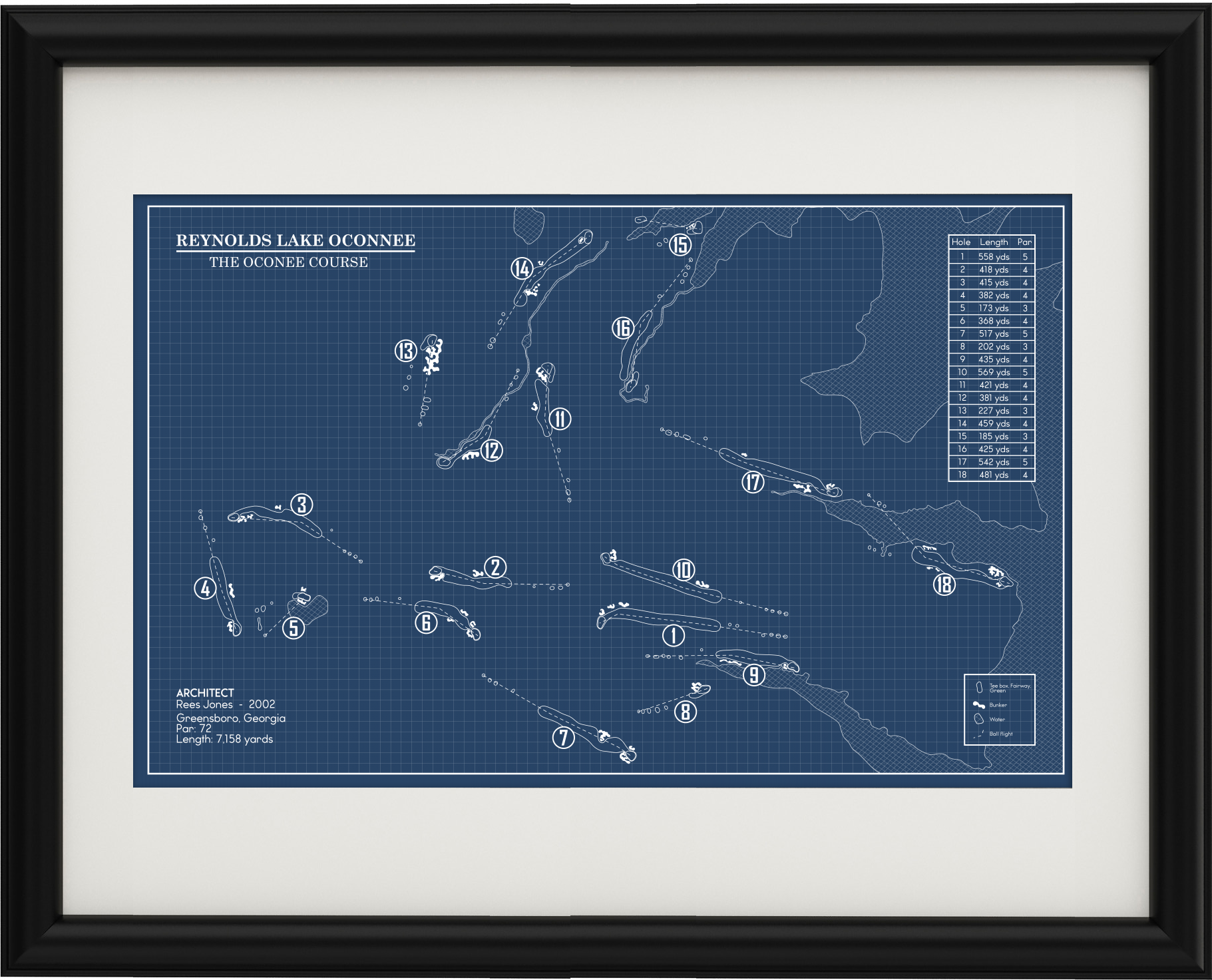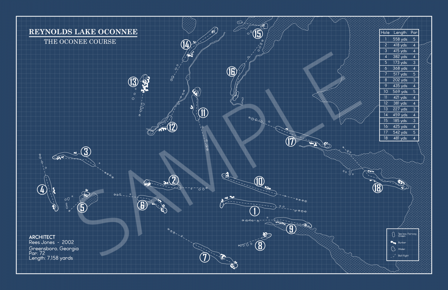 This Golf Course Blueprint is of Reynolds Lake Oconee Oconee Course in Greensboro, Georgia. Included elements of the design are the water and bunker hazards, course length from the tips, and architects.