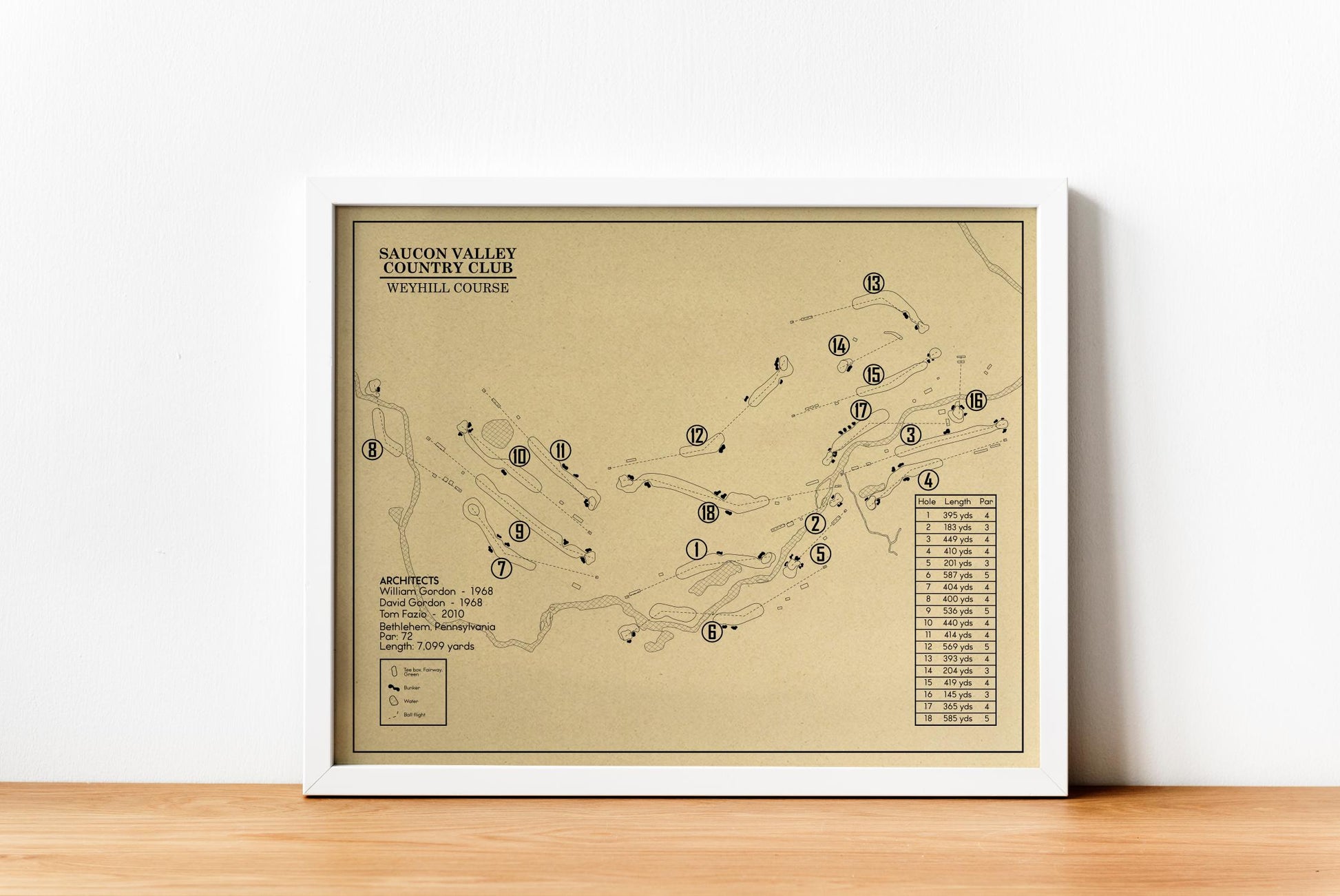 This Golf Course Outline is of Saucon Valley Country Club Weyhill Course in Bethlehem, Pennsylvania. Included elements of the design are the water and bunker hazards, course length from the tips, and architects.