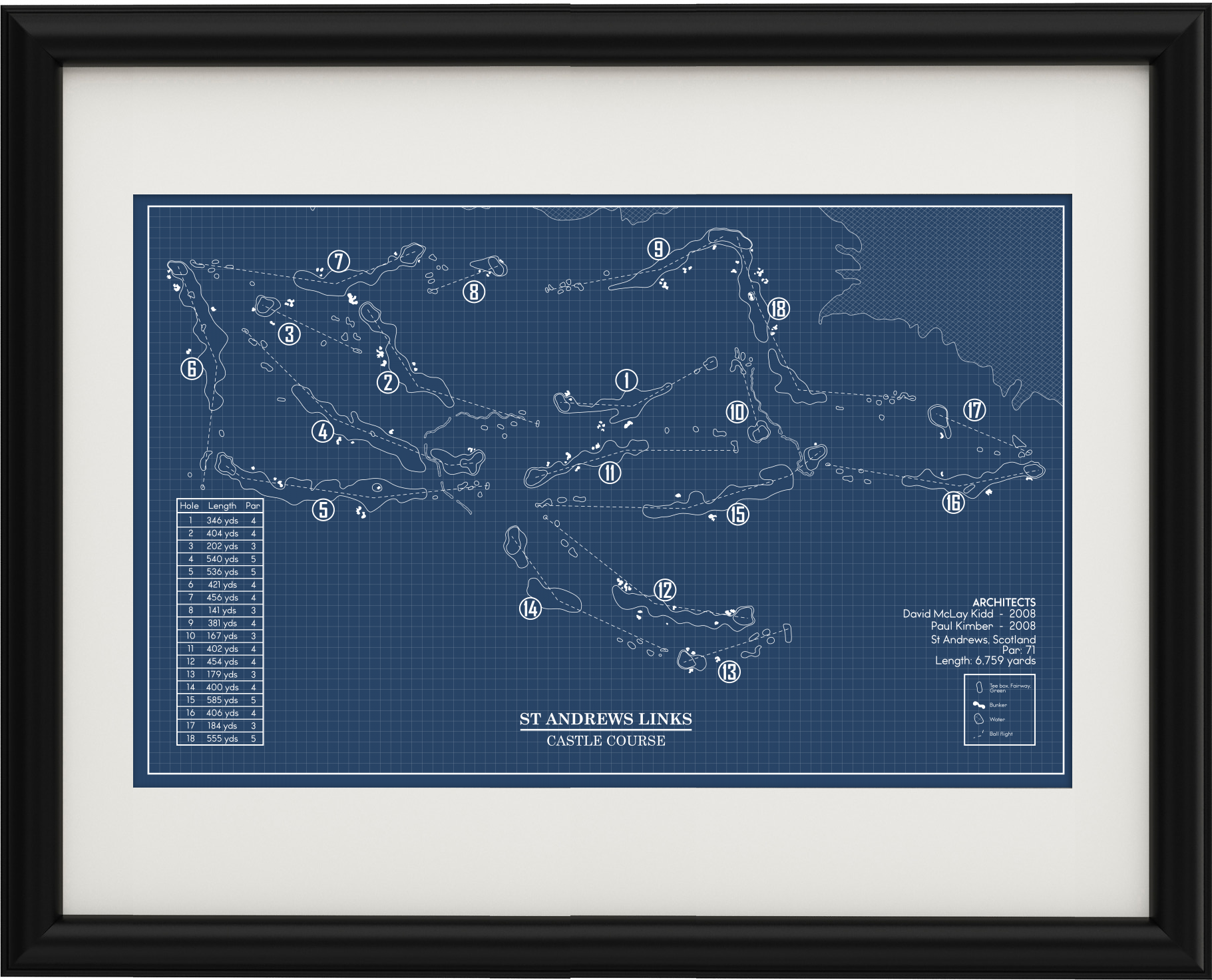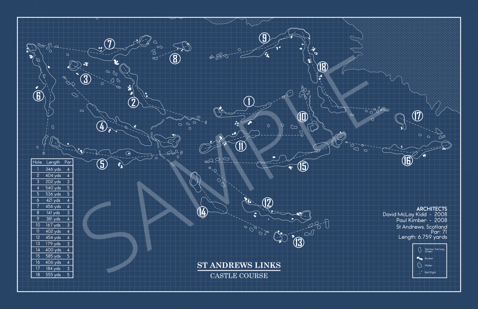 This Golf Course Blueprint is of The Castle Course at St Andrews Links in St Andrews, Scotland. Included elements of the design are the water and bunker hazards, course length from the tips, and architects.