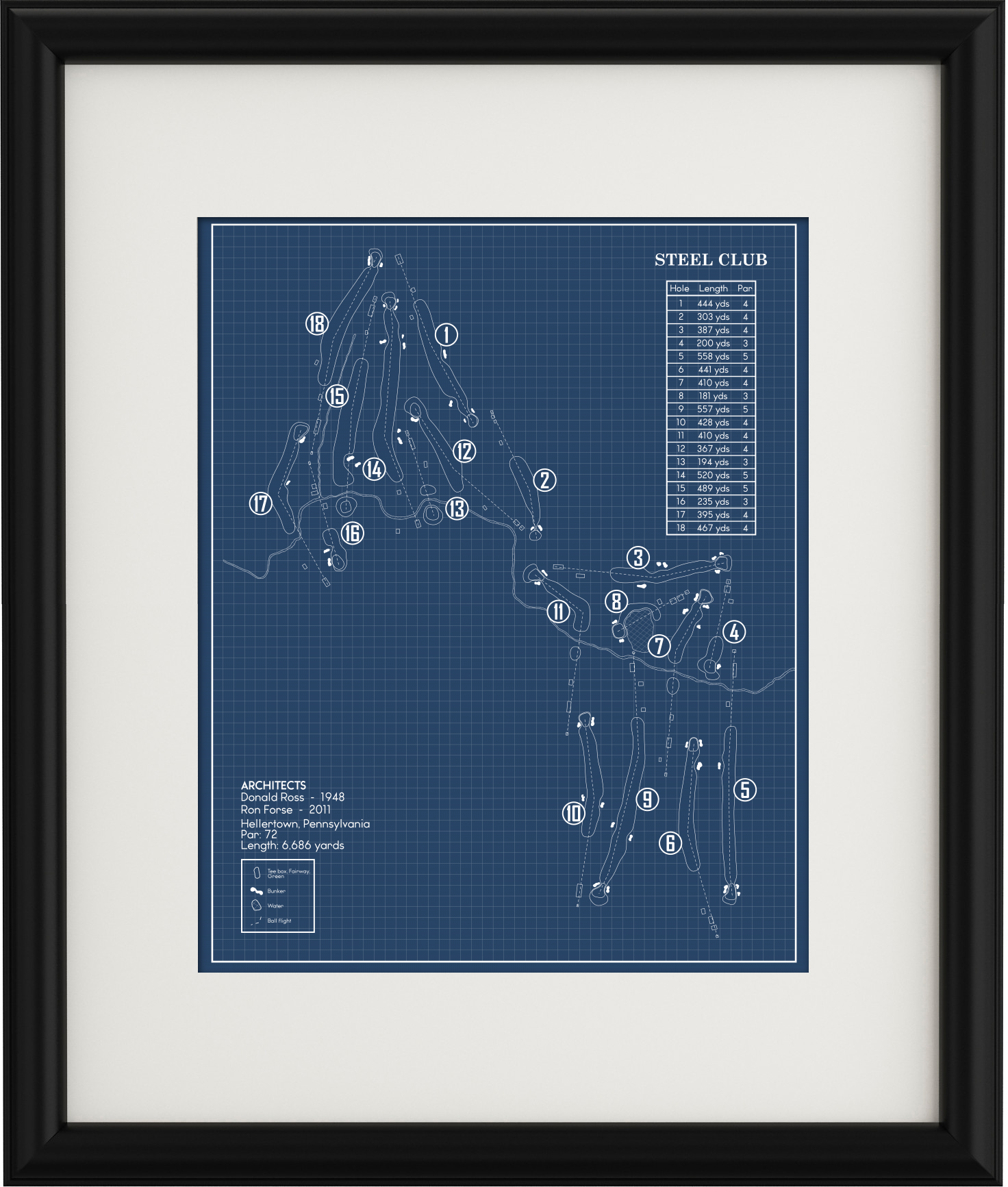 This Golf Course Blueprint is of Steel Club in Hellertown, Pennsylvania. Included elements of the design are the water and bunker hazards, course length from the tips, and architects.