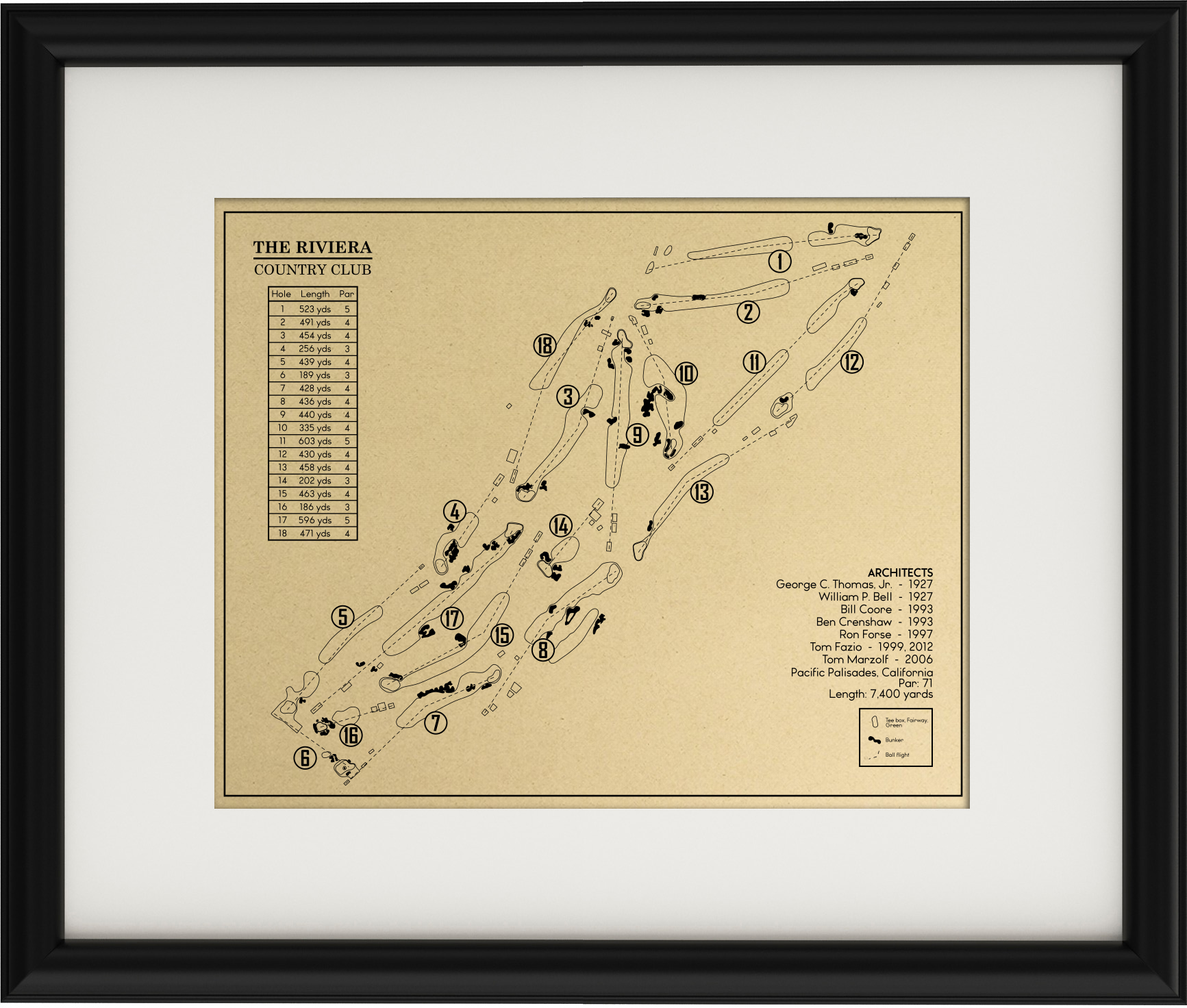 This Golf Course Outline is of The Riviera Country Club in Pacific Palisades, California. Included elements of the design are the water and bunker hazards, course length from the tips, and architects.