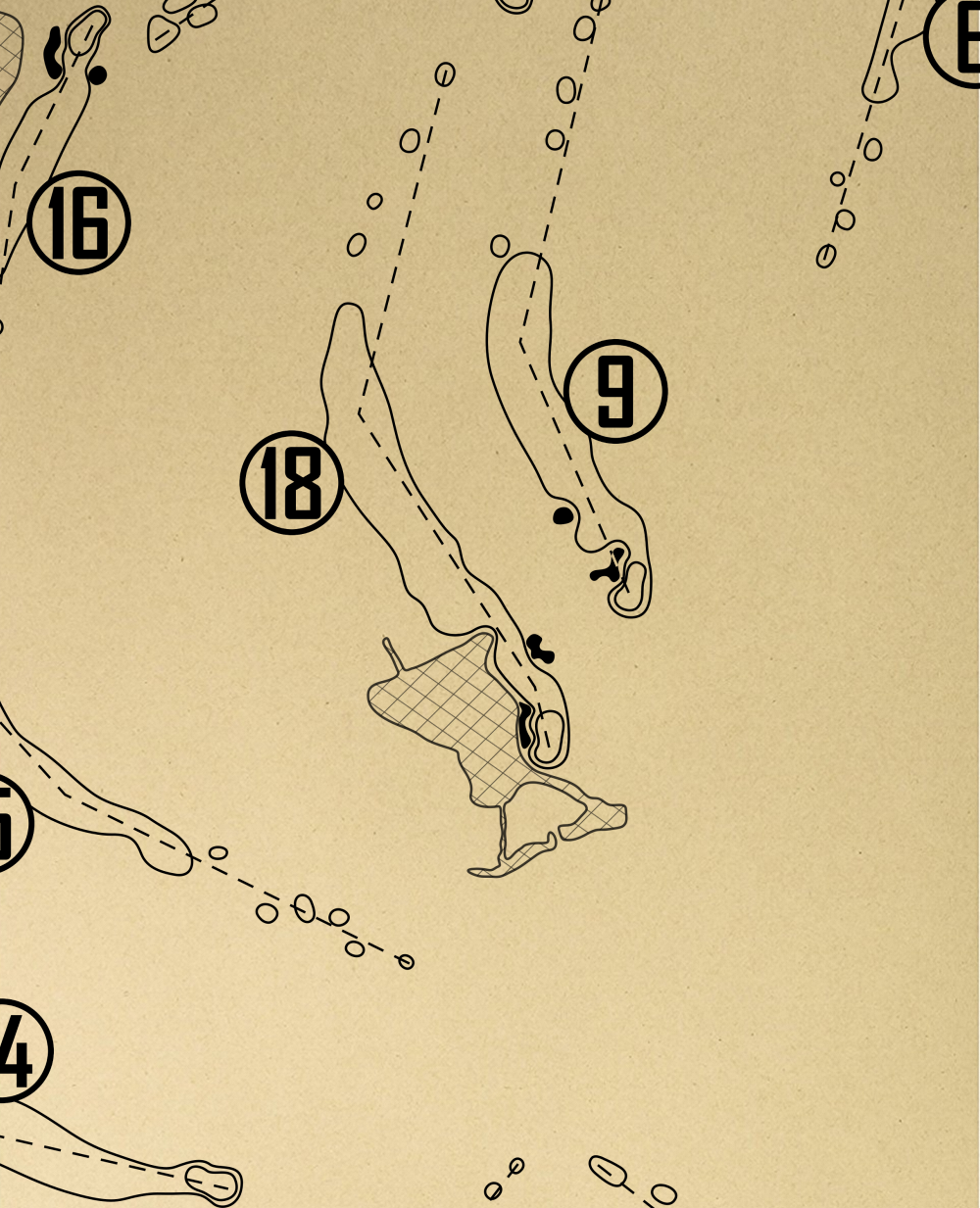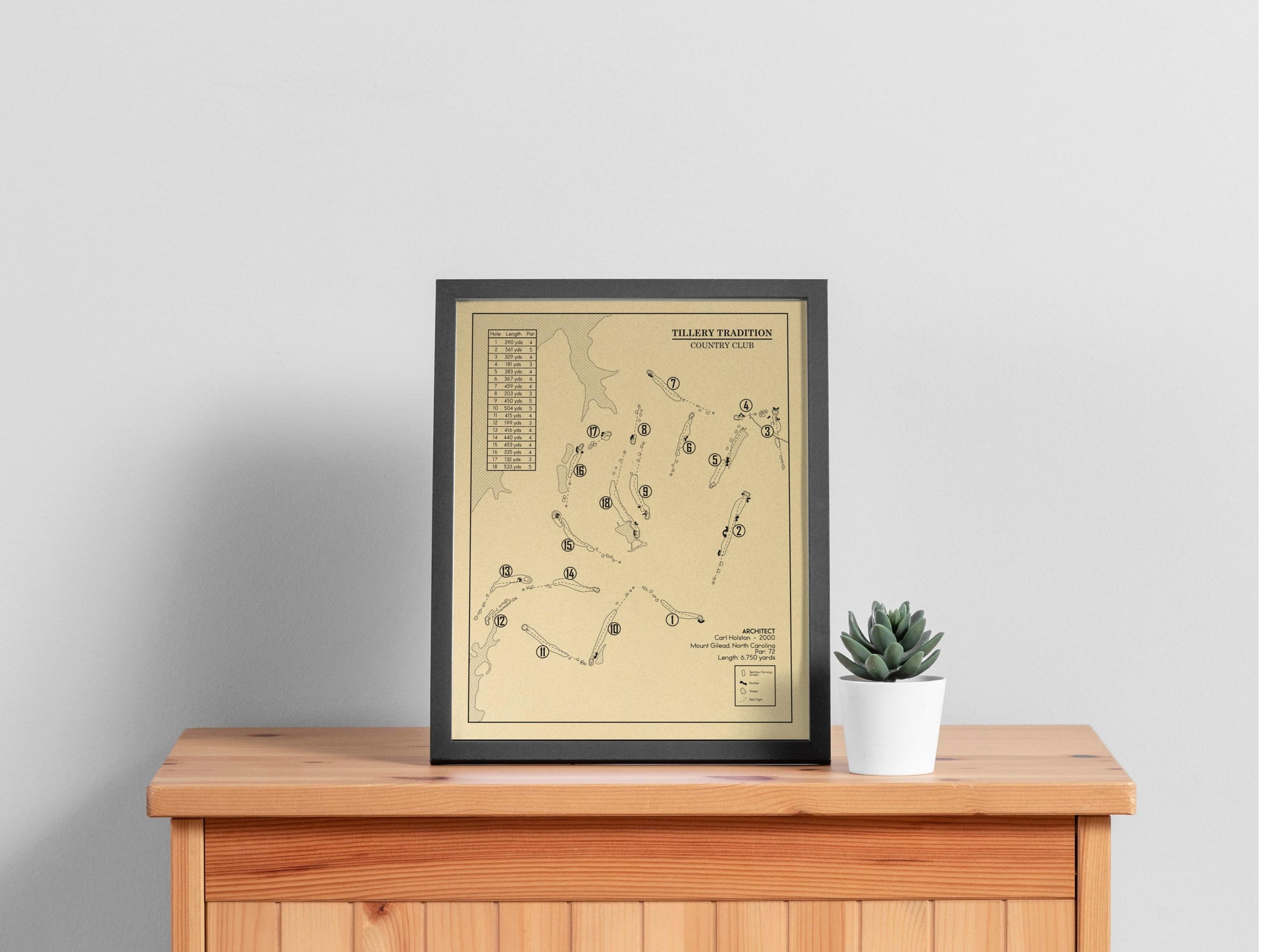 This Golf Course Outline is of Tillery Tradition Country Club in Mount Gilead, North Carolina. Included elements of the design are the water and bunker hazards, course length from the tips, and architects.