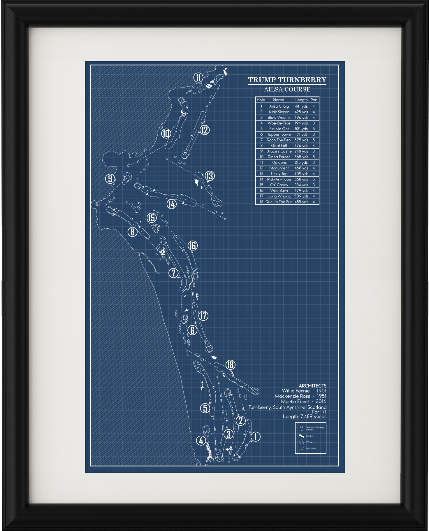 This Golf Course Blueprint is of the Trump Turnberry Ailso Course in Turnberry, South Ayrshire, Scotland. Included elements of the design are the water and bunker hazards, course length from the tips, and architects.