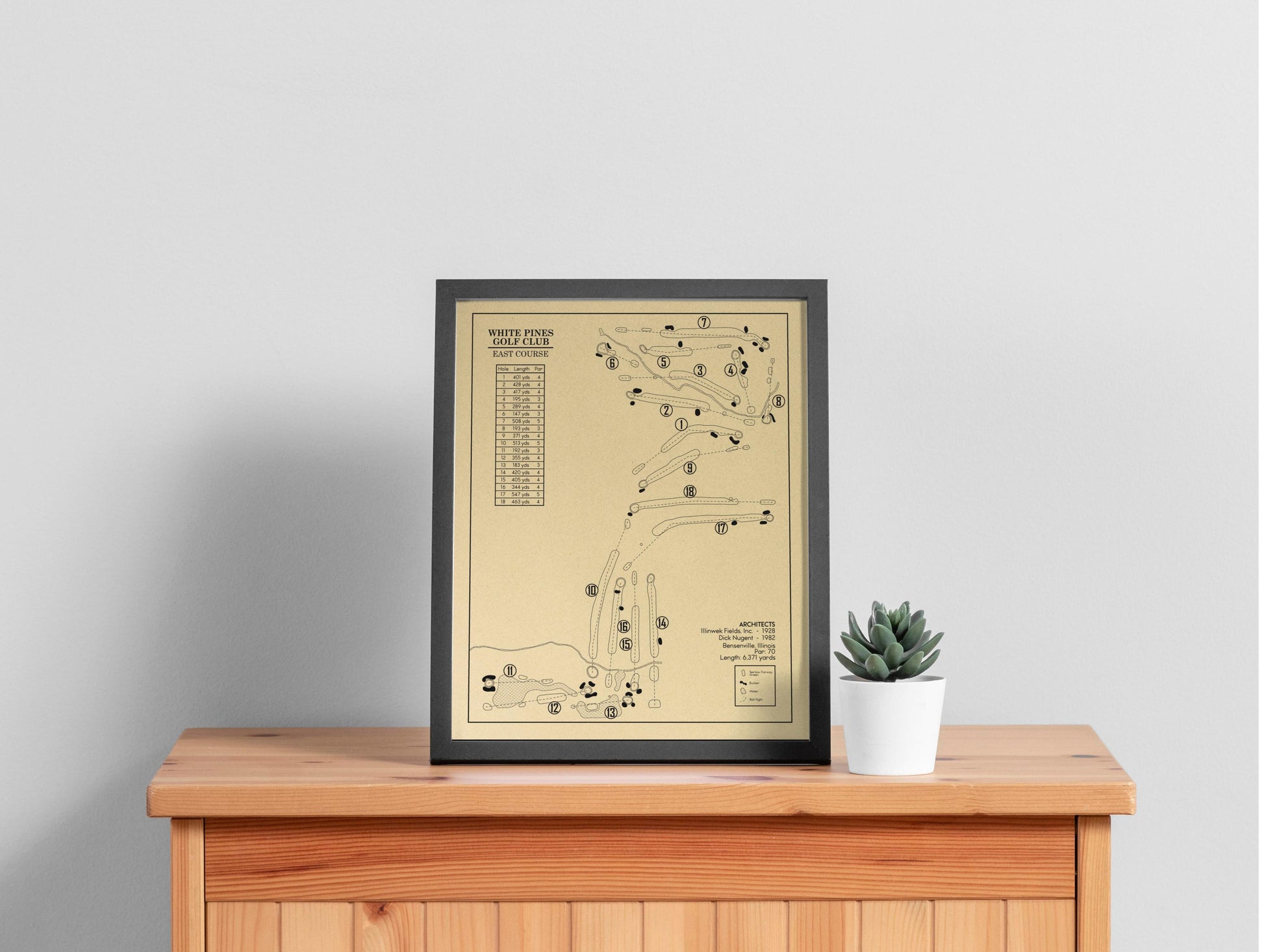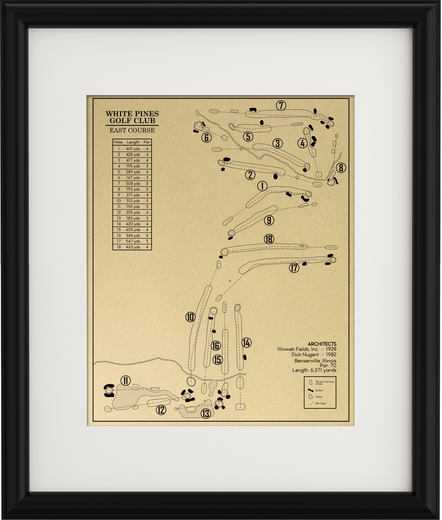 This Golf Course Outline is of White Pines Golf Club East Course in Bensenville, Illinois. Included elements of the design are the water and bunker hazards, course length from the tips, and architects.