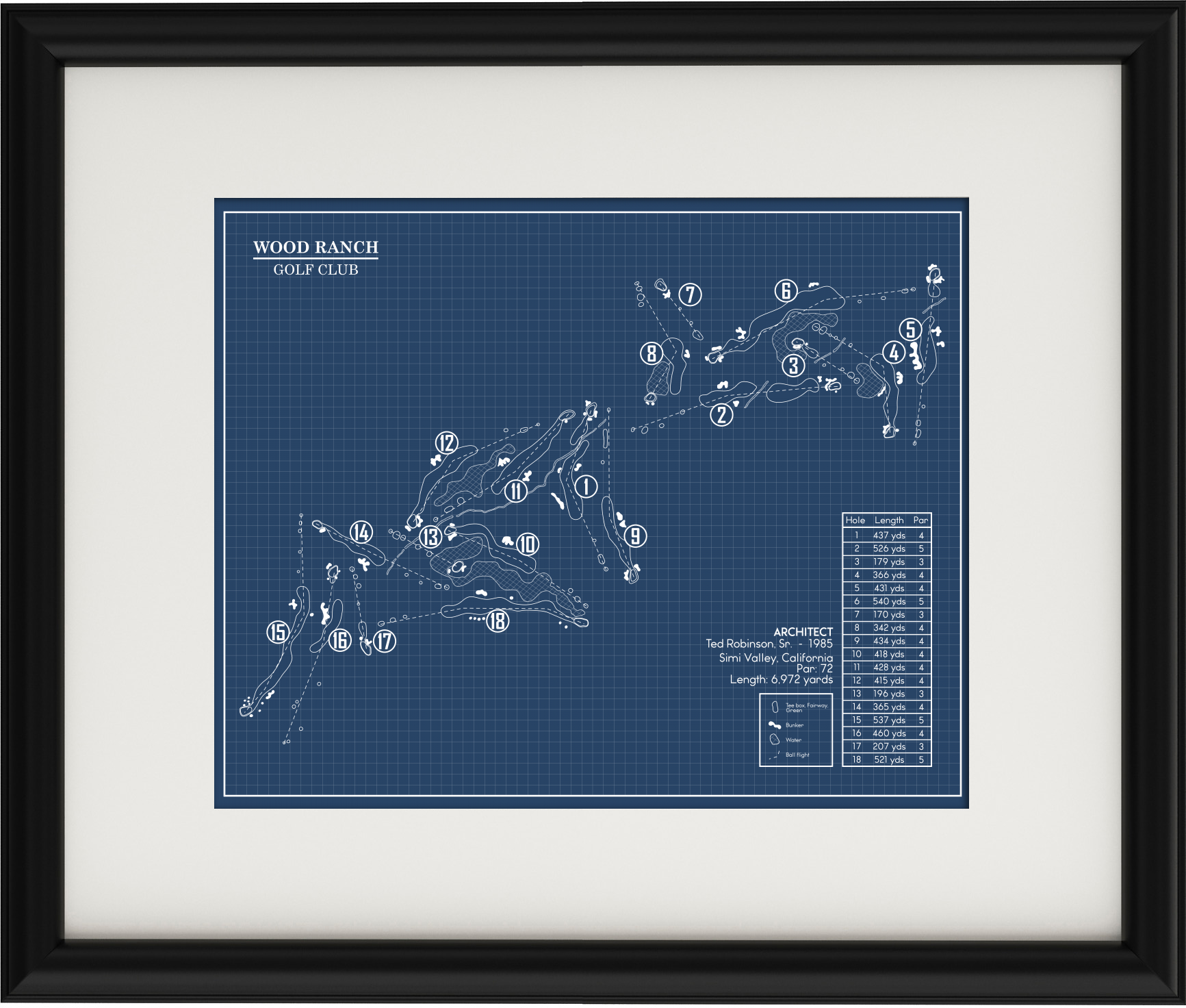 This Golf Course Blueprint is of Wood Ranch Golf Club in Simi Valley, California. Included elements of the design are the water and bunker hazards, course length from the tips, and architects.
