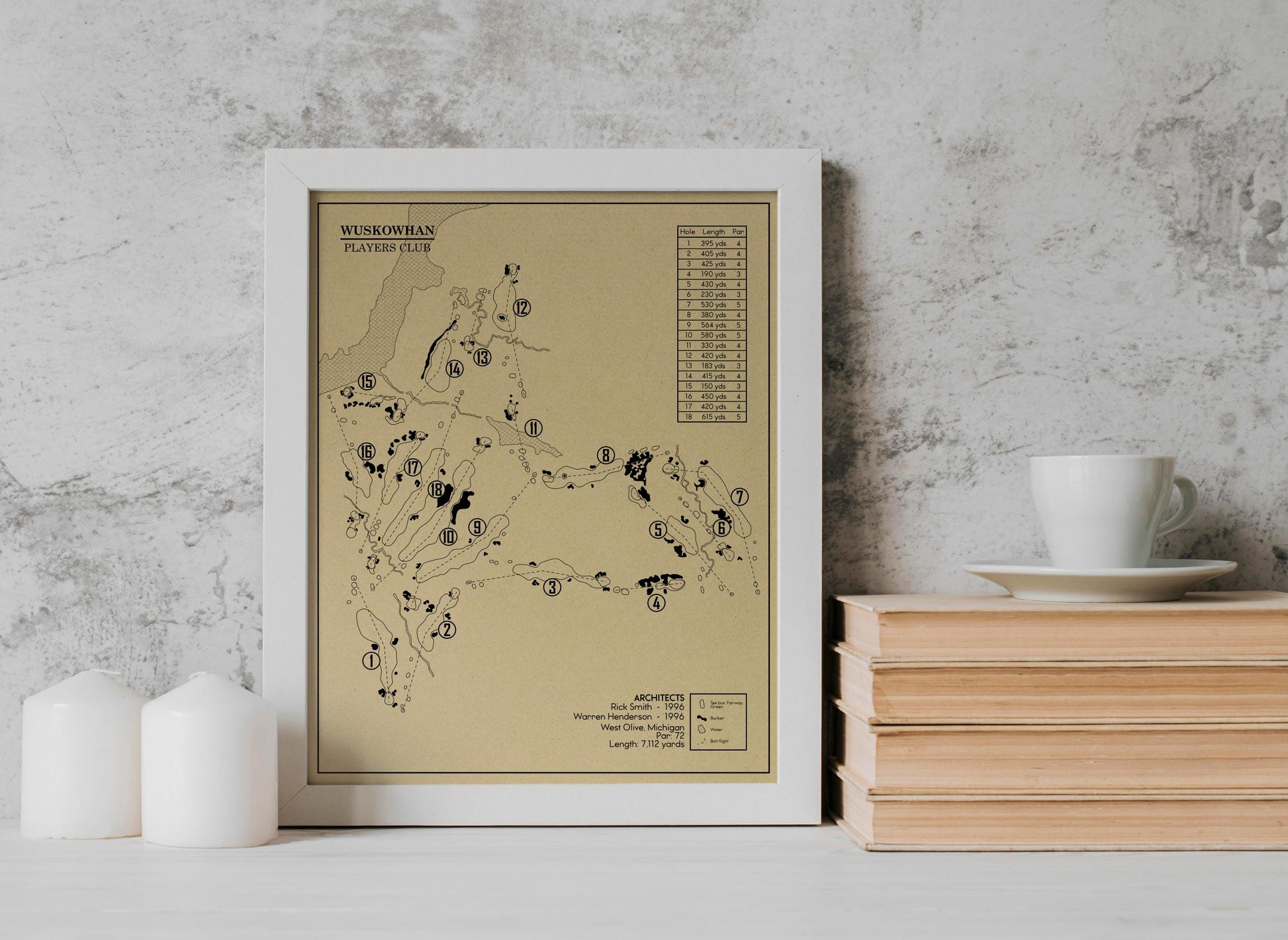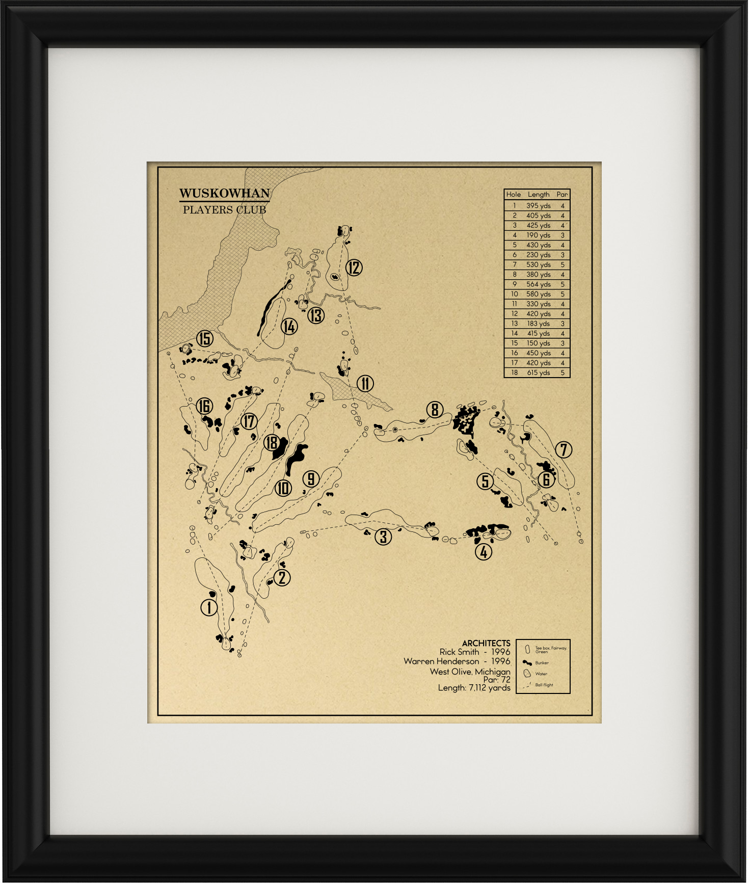 This Golf Course Outline is of Wuskowhan Players Club in West Olive, Michigan. Included elements of the design are the water and bunker hazards, course length from the tips, and architects.